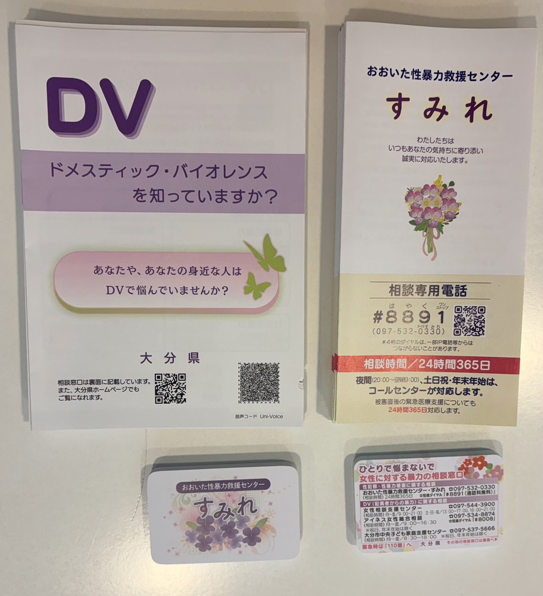 大分県でも「アイネスパープルリボンプロジェクト」において、暴力根絶を呼びかける取り組みを行っています。事務所玄関にDV防止啓発リーフレットや相談窓口周知カードを設置いたします。